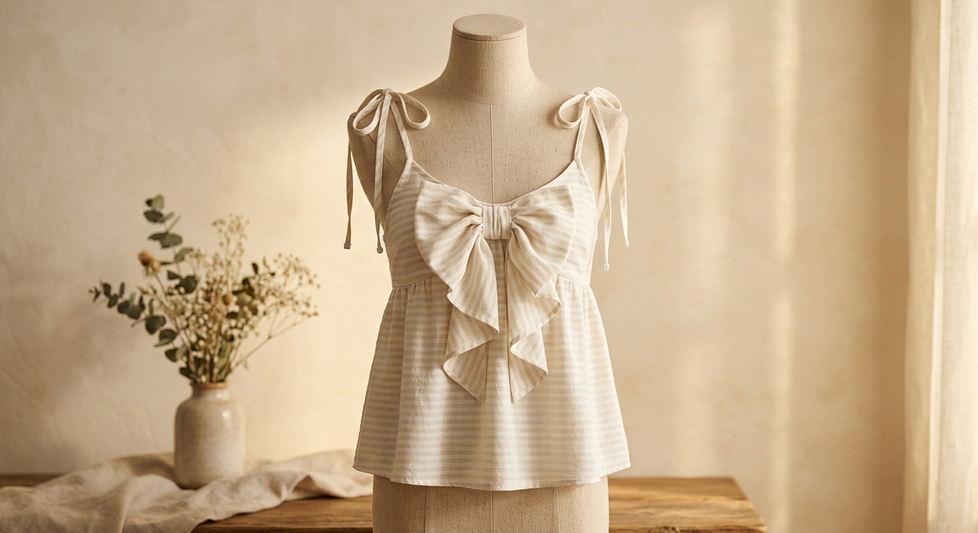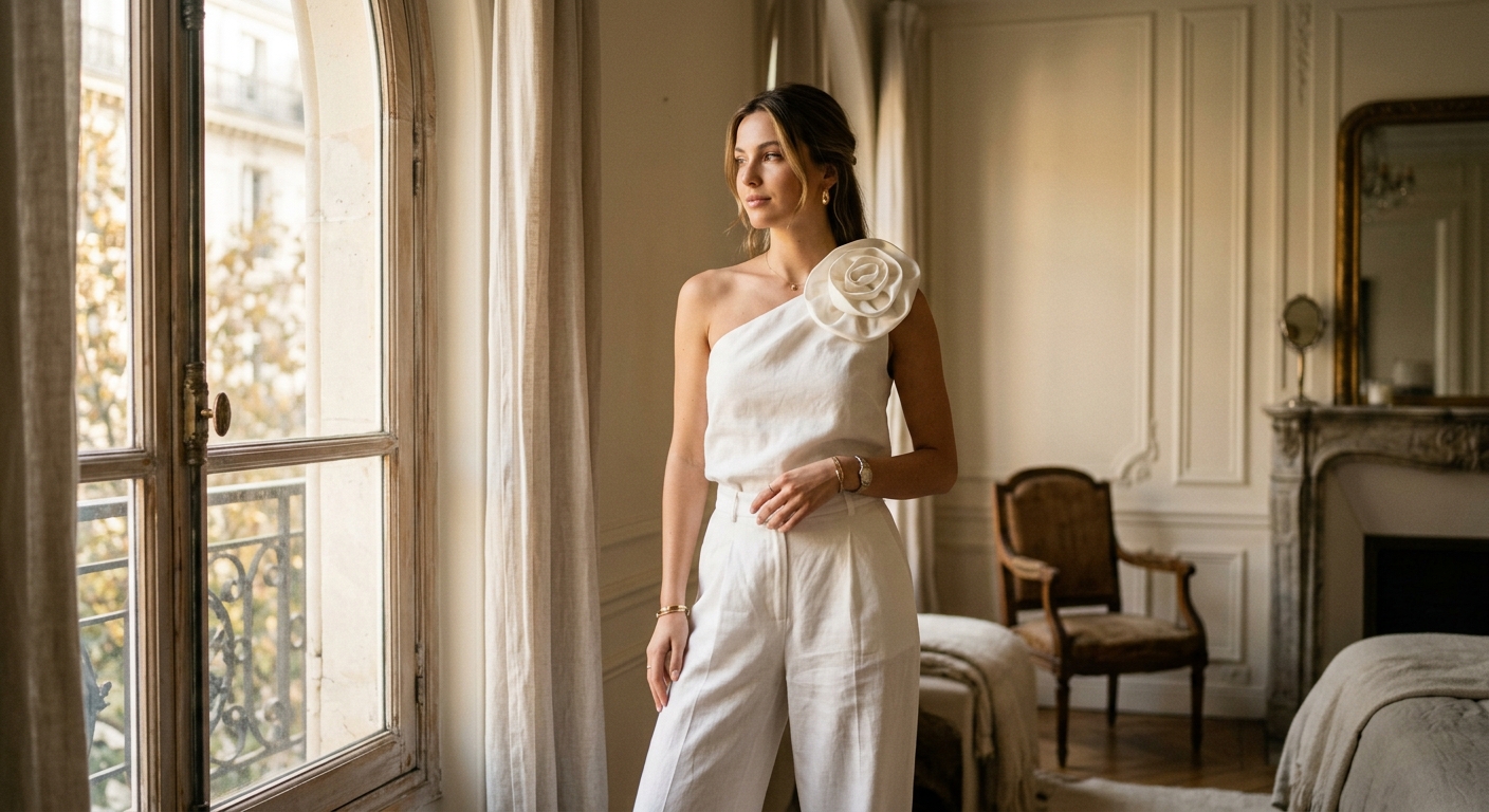Smocked tops, wide-leg trousers, and the signature rosette — all in cream, ivory, and sand.